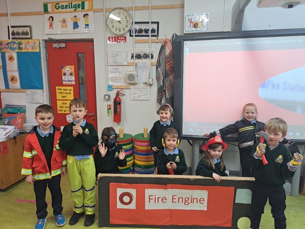 Junior and Senior Infants have a structured Aistear time every week. They visit the vets, the doctors, the fire station, Santa’s workshop etc and they learn all about these places through play and roll play. Here are some of our Infants at the Fire Station!